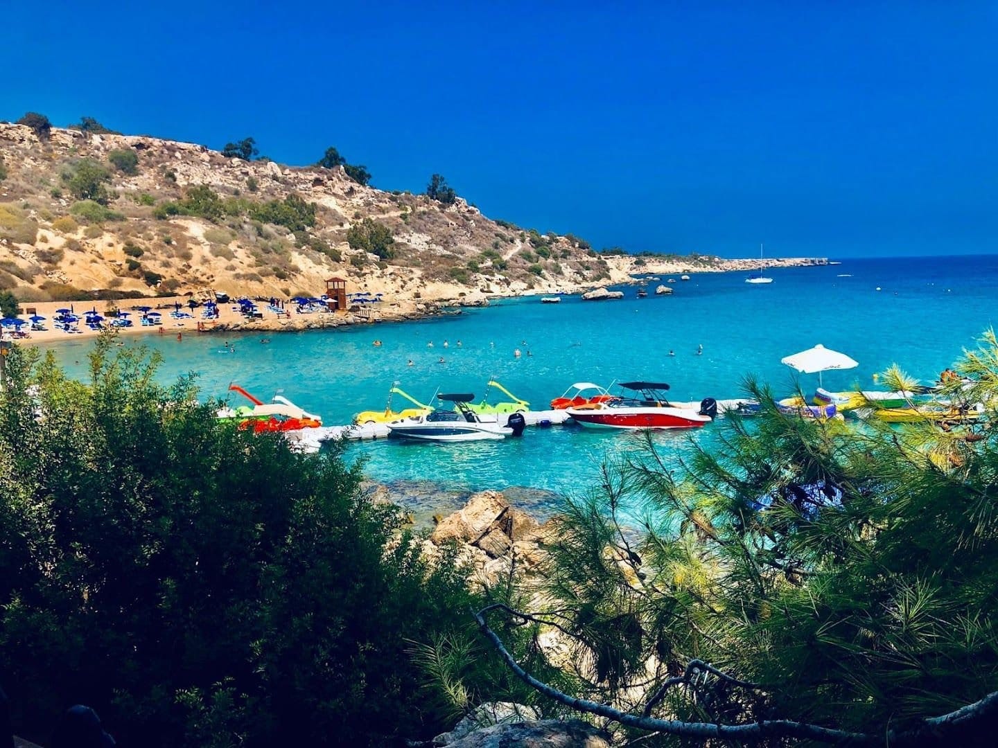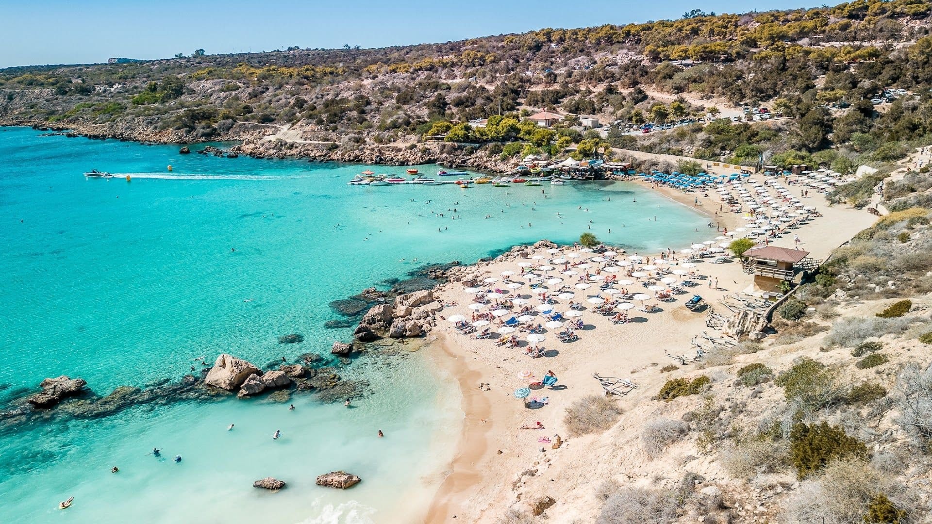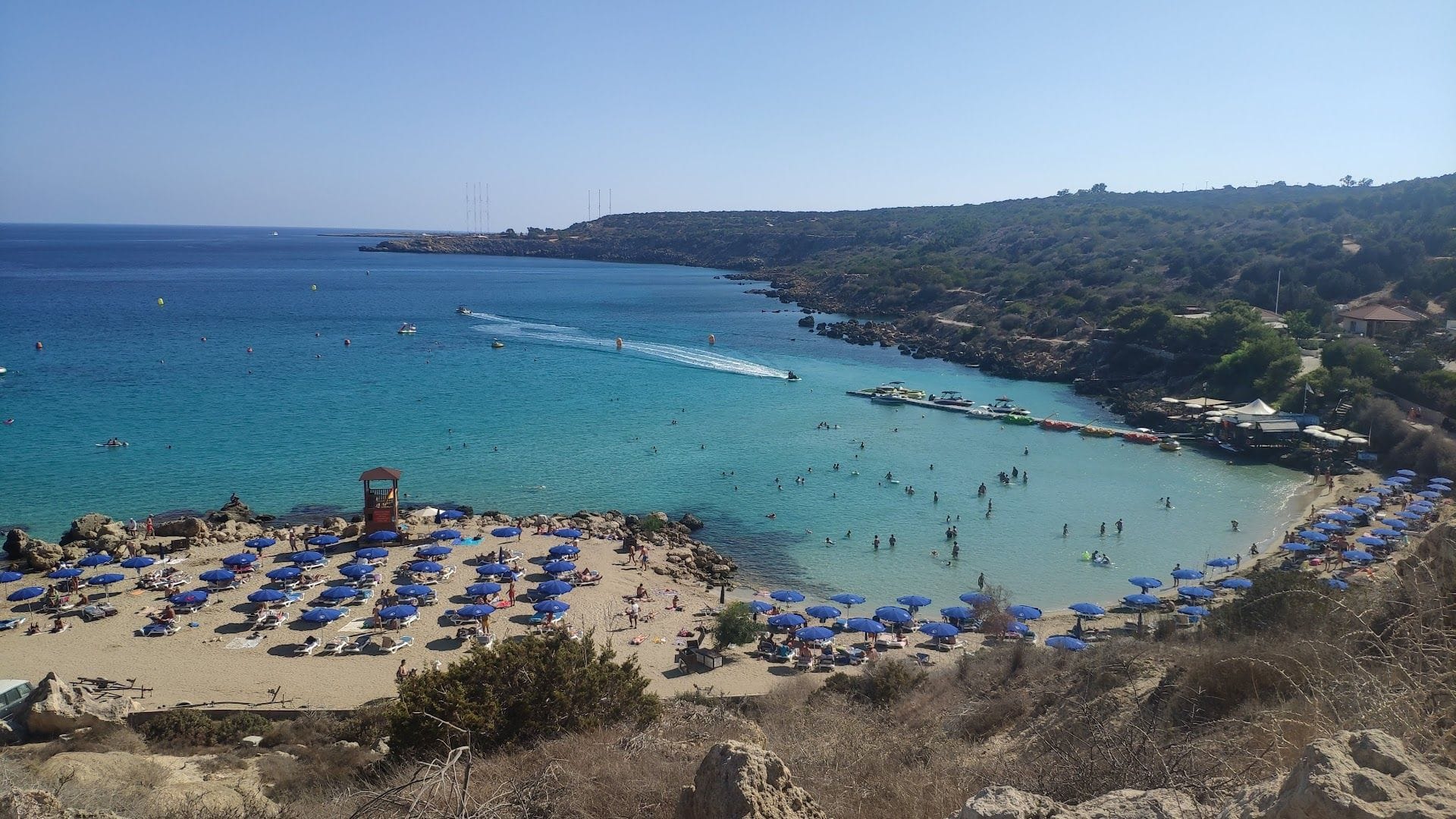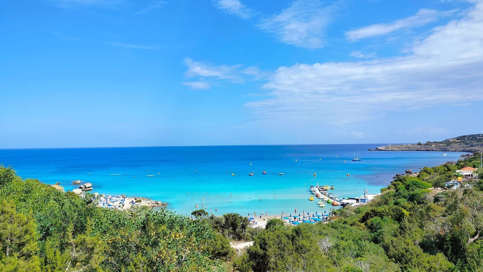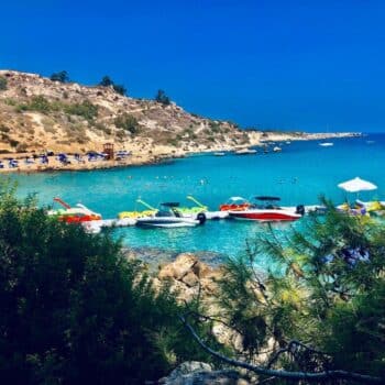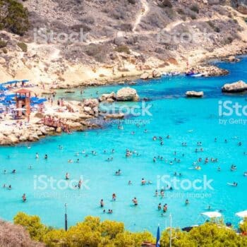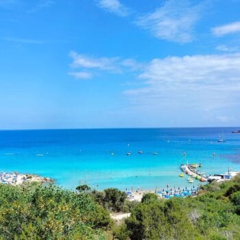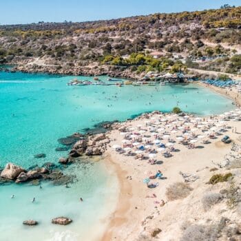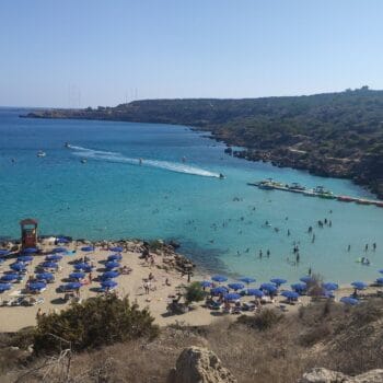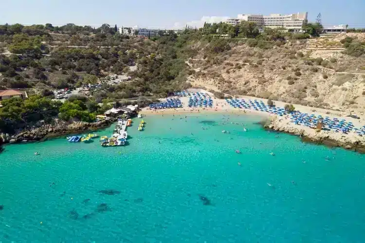 Konnos Beach is located in the northern part of Cape Greco National Forest Park, at the eastern edge of Ayia Napa, where it meets the Protaras region. This Blue Flag awarded picturesque bay is a hidden gem within the park, known for its tranquil, crystal-clear waters and breathtaking natural beauty. Despite being slightly secluded, Konnos Beach is easily accessible from both Ayia Napa and Protaras, making it a popular destination for tourists and locals alike.